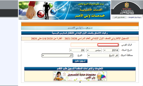 - الدخول عبر الموقع رابط التقديم للصف الأول الابتدائي من هنا http://parent.emis.gov.eg/date_pers.aspx